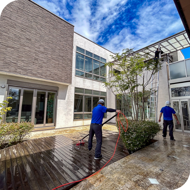 足場を使わず、高圧洗浄機も使わないこの工法は、お住まいの外壁を優しく洗い上げます。